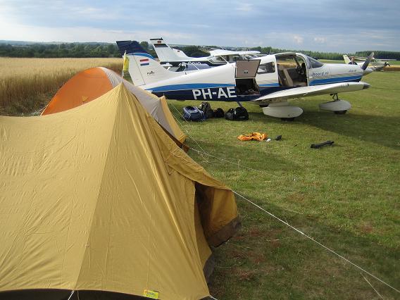 We hebben ons tentje opgezet naast het vliegtuig, een ideale camping! Ok, de douche is wat spartaans: een tuinslang waar koud water uitkomt. Maar dat neem je graag op de koop toe als je op zo’n mooi veld staat samen met 50 andere vliegtuigen.